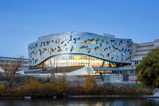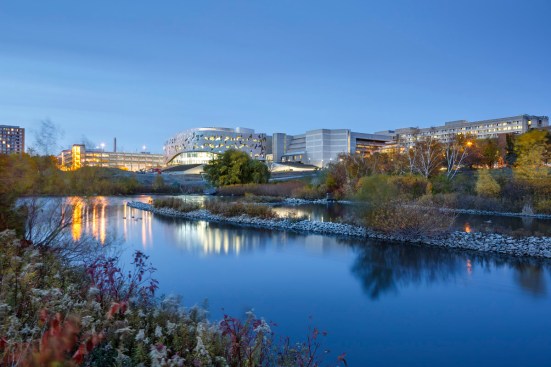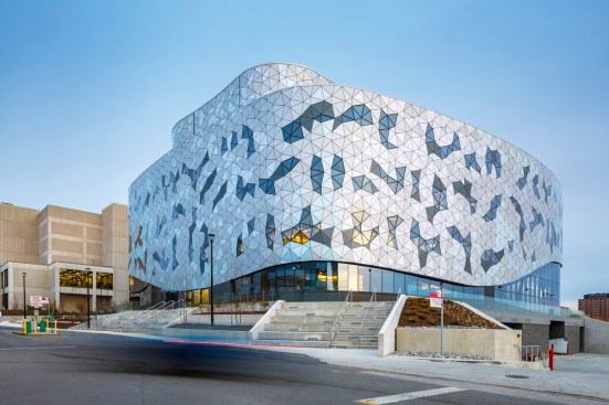 A beacon for invention in the outer ring of York University’s campus, The Bergeron Centre’s bold architecture represents limitless creativity. Reflective of Renaissance principles of innovation and nonconformity, a cloud-like triangular glass façade stands bold. The undulating façade is comprised of a series of triangles positioned according to a precise and complex algorithm. Evoking the properties of a cloud, it reflects light and pattern across campus and into the interior.