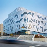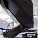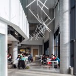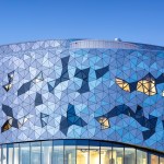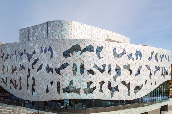– The ‘Whimsy’ abstract facade is grounded in a mathematical, triangle-based algorithm, creating a drifting cloud-like form with changing light and patterns reflected in the interior spaces.