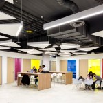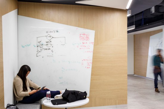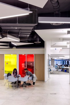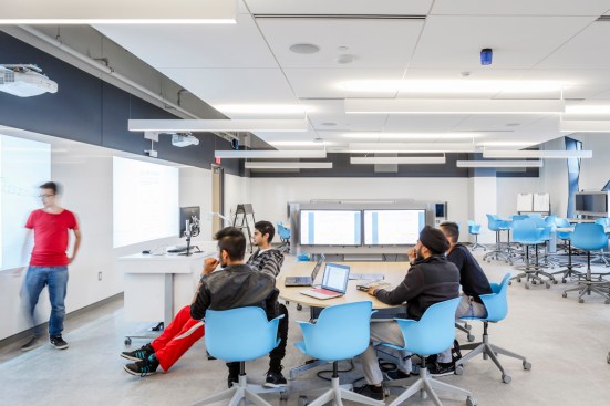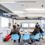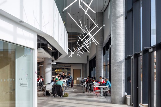 – This student-centric philosophy percolates through the building, even corridors become places to learn, create, and collaborate with small niches, banquettes and white boards throughout.