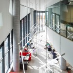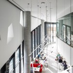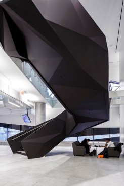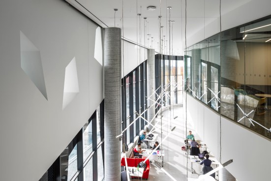 Inside the cloud, rows of desks and lecture halls are replaced with active learning classrooms. A massive multi-storey materials testing lab provides an unprecedented hands-on approach to both learning and teaching that was previously only available to engineers in the field. Bright open spaces replace traditional classrooms and labs. Integrated pods are configured with audiovisual learning tools that encourage students to spontaneously plug-in.