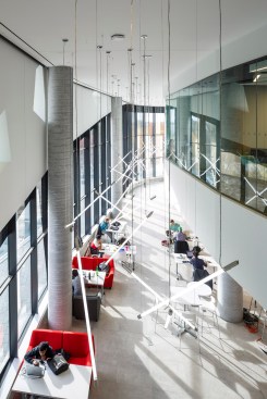 – Prominent panoramic views and social spaces are on the main level where students gather.