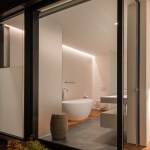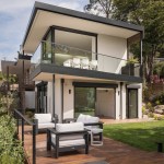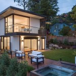 The renovation of a 1960s Berkeley home focused on a modern European style, prioritizing expansive views and spacious interiors within the original structure’s footprint. The design highlights include elevated living areas with 14ft ceilings and a full-height sliding door to merge indoor and outdoor spaces, centering on views of San Francisco and the Golden Gate Bridge. A deck extends towards these views for optimal outdoor enjoyment. The minimalist, white interior draws attention to the scenery, with a converted lower level into a master suite. The redesigned exterior features a landscaped yard with a lawn, fountain, and hot tub, all oriented towards the picturesque vista.