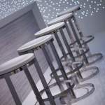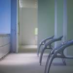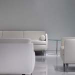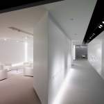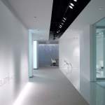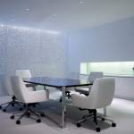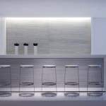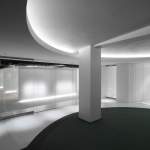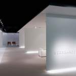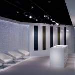 In an all-white, eloquent space, Jhane Barnes Textiles maintains the innovative, architectural theme with floating backlit walls and oval knife-edged openings in the ceiling plane. Inside the oval slits, fabric drapes down to the terrazzo floor, forming a series of cylindrical volumes. Custom-designed credenzas and countertops were installed to complement existing showpieces from the designer’s collection for Bernhardt. Additional mixed use of lighting and materials throughout the small space creates the ethereal quality desired by the client.