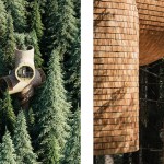 Bert was conceptualised as a treehouse that was shaped by the forest. Like a trunk of a tree the building connects to the soil on a minimal footprint. All functions are stacked above and branch out in different directions. The interiors are kept in dark fabric which creates a cozy, cave-like atmosphere and orients the views towards the large glass openings. The leaf-like shingles on the facade are kept in various shades of browns and camouflages the structures with the natural background.