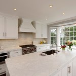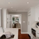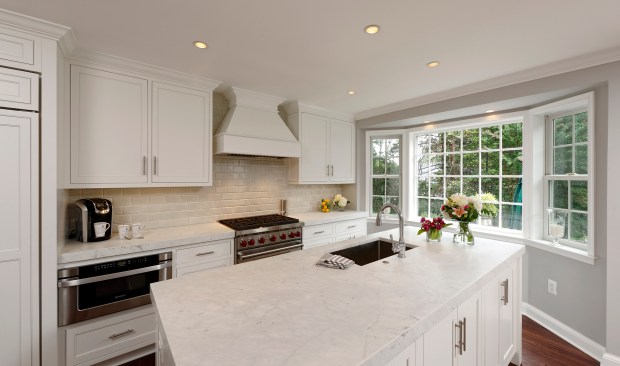 This classic Bethesda, Maryland residence had not been updated in years and the new homeowners turned to the design build contractor for their remodeling project. The goal was to maximize the existing space, improve the flow between the main level areas and create a beautiful, modern kitchen to suit their busy lifestyle. One of the challenges faced by the design team was to improve the connections between the kitchen and the main level spaces in the home. Access from the existing garage was through a doorway passing outside, onto a landing and back into the kitchen. The solution featured a new direct entry into a stylish butler’s pantry connecting the dining room and the kitchen. The kitchen cabinetry and layout were reconfigured eliminating the door and a small window. The awkward built-in pantry and planter were removed between the kitchen and family room resulting in a graceful transition, abundant natural light and lines of sight through the whole space. The centerpiece of the new space is an exquisite new fireplace featuring a marble hearth and surround as well as custom mantle. The kitchen features white cabinetry, mitered-edge marble countertops and white subway tile backsplash. Space-saving details abound, and cabinets and drawers were configured specifically to meet the homeowners’ needs. As part of a larger renovation project, all areas of the main level were touched, from the reworked hallway, to the remodeled powder room to the living room fireplace. A neutral color palette and new or refinished custom flooring provide continuity throughout. The homeowners are thrilled with the results.