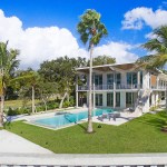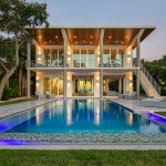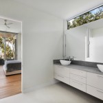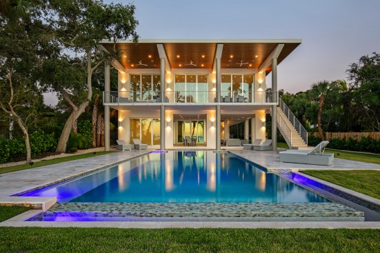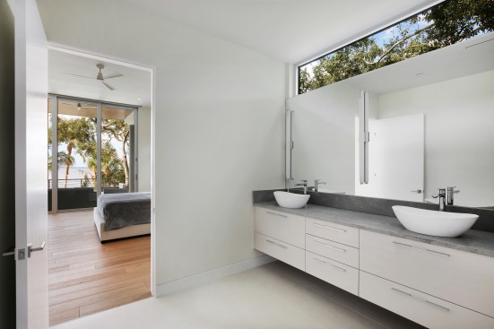 The grounds around the residence continue the linear footprint as tropical greenery speaks to the clean and simple lines of the home and the lush backdrop becomes just as much of the home as the raw materials. A lap pool slides under the overhanging decks and spills out to an infinity edge overlooking the waterway.