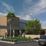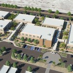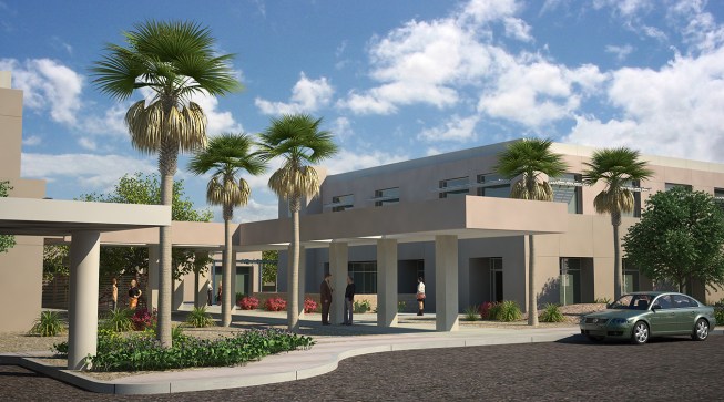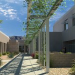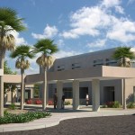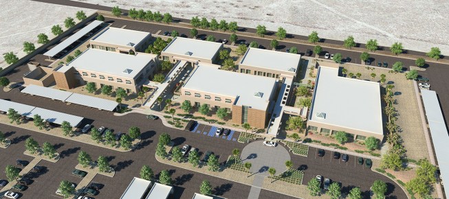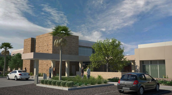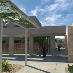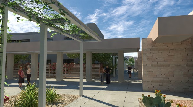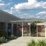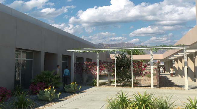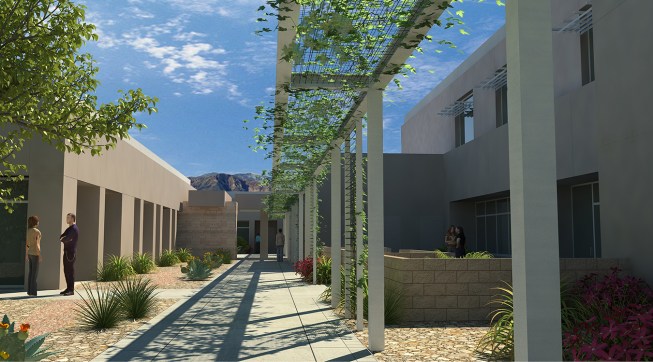 To provide shade from the extreme desert heat, Moon Mayoras Architects designed covered exterior pedestrian walkways, trellises, courtyards, and landscape features interconnecting each building. The entire complex incorporates desert themed architectural elements found in the surrounding Coachella Valley, and was designed to incorporate sustainable landscape features.