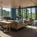 The main idea in creating the interior was to draw the surrounding nature inside, to make it dominant, and to arrange an auditorium inside the chalet with angles lined up through the window openings.