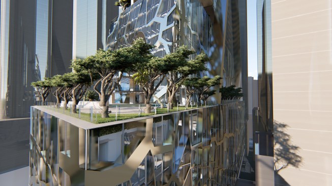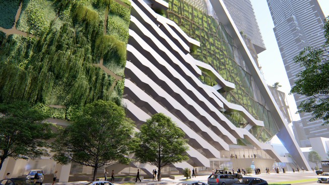 The proposed character of the BMW interface with Southbank Boulevard evokes a blend between an urbane street edge condition, and a lush, shaded garden environment. The proposed City Road façade will feature green waterfalls cascading from sky gardens.