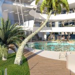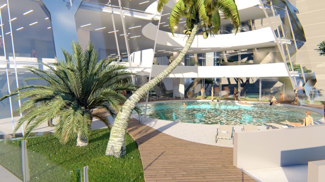 Level 9 draws us to the top of the Vortex, where a lush tropical rainforest character surrounds the pool. Planting and lawn is integrated into the terrace, with seating edges for quiet relaxation.