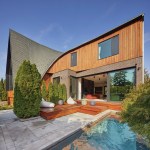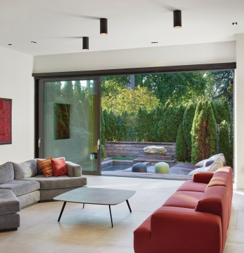 Bortolotto’s starting point for the design was the original house’s atypical front courtyard. The lushly landscaped oasis with a lap pool had grown on the family. To preserve and make the most of this remarkably private retreat, Bortolotto began with an L-shaped building, with a chalet-style elevation on the west side, that balances the courtyard on the right. The elevation’s peak forms a complementary relationship with the Tudorrevival style home adjacent.