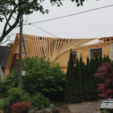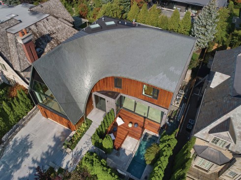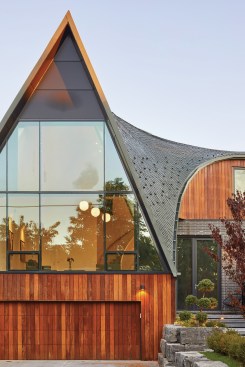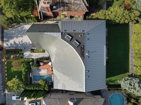 Bézier Curve House began as the initiative of custom-home builder Farhad Kazmian, owner of Abond Homes, to replace his family’s home in Toronto’s Lawrence Park neighbourhood. His desire was a family home that would also serve as a showpiece for his business. In particular, Kazmian wanted a house that would be the antithesis of the boxy fishbowl. Searching for “contemporary house with sloped roof,” he discovered Tania Bortolotto and her eponymous studio’s spirited and sculptural style.
