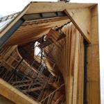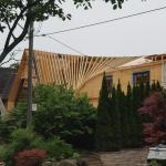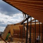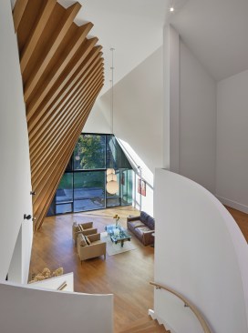 To economically construct the roof design, the team turned to old world techniques. Its structure was constructed using evenly spaced wood joists that were tied and pulled to their maximum tension, thereby fanning them into a natural curve. At the key juncture, the beautiful structure was left exposed and wrapped in red oak veneer, creating a sculptural moment that recalls a gothic cathedral while also setting up other interior details. For example, a curved central staircase picks up on the rhythm of the roof rafters and the second floor hardwood flooring was laid at the same angle as the stair and rafters to splay through the home’s private spaces. Altogether, these interior details create a feeling of movement that washes through the house.