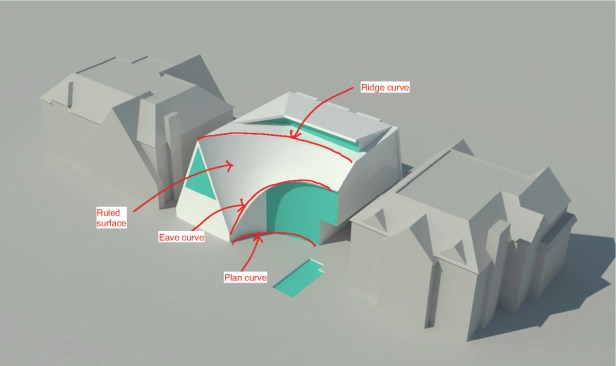 Employing Grasshopper architectural modelling software, the architects designed a softly curved roof that extends outward from the straight edge of the A-frame and cradles the courtyard and front door in three dimensions. A Bézier curve, the roof has an organic feeling that softens the overall form of the building. Clad with hand-laid, diamond-shaped zinc shingles, the material simultaneously recalls a shimmering reptilian body while also drawing connections with neighbouring slate roofs. In the valley above the doorway, a series of eye-catching, twisted zinc snow guards form a protective barrier and highlight the dip in the roof.