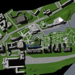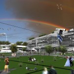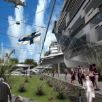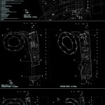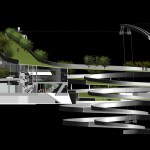 The entrances to the building are on the east and west sides where an imaginary “binding” allows the pages to be flipped north and south. The pedestrian drop off area is next to the entrances and the main elevator, and above the tunnel system beneath the building. The upper pages on the north side are “ripped” along their lines of text from their edges to the binding, spilling apart to form a gap which reveals a garden that faces the bay and passing vessels. The northeast side of the roof supports solar panels which generate electricity for the building, the intent being for self-sufficiency and no dependence on the city’s power grid. The northwest side of the roof structure extends to form a sinuous and gently undulating spiral which runs down to the bottom garage level and seemingly into the soil of Helsinki. It represents duality of space, providing recreation as a ski run in winter and a garden/jog path in summer, and always providing nurturance of Helsinki’s intellectual landscape. The winter ski run has a ski lift which returns skiers to the top of the building, the activity making the building very alive, attractive, and energetic. The run faces the cafe, the restaurant, and the main lobby of the building, forming an attraction for occupants of the surrounding buildings and its own occupants as well. During the summer, the spiral ramp becomes a garden and jogging path which may be accessed from different levels, including from the cafe, one level above the ground. The free standing structure, which supports the ski lift in winter, turns into a powerful waterfall in summer, easily seen from any of the nearby buildings. The positioning of the ramp does not at all block the visual connection between the bay and Kiasma Museum, but rather the opposite – playing a major role as an extension of the sprawl that starts between Sanoma House and Kiasma and extends to the bay. The spiral ramp could also be used in a third way – as temporary overflow parking for unexpected attendance at the area’s activities.
