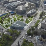 The architectural vocabulary of BIBLIO-Centrum also extends out to Makasiinipuisto Park. The entire park is surrounded with a free standing metal structure with cables positioned randomly above it, giving the impression that they hold the site together in tight communication. They also suspend the overhead light fixtures that make pleasant evening views from the surrounding buildings. These cables are echoed on the ground as lawn dividers, giving an artistic touch to the landscape, and suggesting a connectedness and unity of the buildings surrounding the Park, and by implication, one that includes the rest of Helsinki.