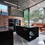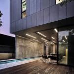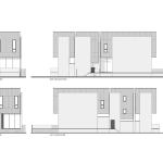First floor spaces where communal spaces are arranged have 12’ high ceilings. In the rear unit an exterior deck extends from the inside level over the rear yard connecting to a raised pool. Two sliding glass walls open to create a poly-access opening to the exterior including the pool which is partially covered by the structure above. The front unit façade is glazed from floor to ceiling as well with 15’ wide sliding panels opening to a deck flanking the front sidewalk.