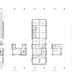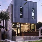 The forms are configured to convey a transparency of internal use. The upper floors contain private spaces wrapped by exterior surfaces forming an echelon of suspended cubic forms legible from multiple viewpoints including the underside. Exterior cladding wraps as a ceiling to materially connect the outside within. The cubic forms are supported by a series of exposed concrete walls with a gap between to visually render each form distinctly. The static forms juxtapose animated interior space as a frame to reinforcing the transparency of the 1st floor interior.