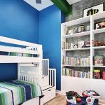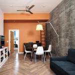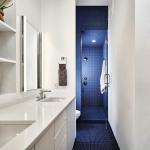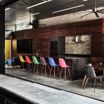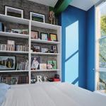 Finishes on the first floor are raw and exposed, serving as a backdrop to render activity and furnishing more vividly. Concrete walls are exposed where possible and kitchen cabinets are clear stained walnut with handles routed into horizontal edges. Finishes on the upper floors, by contrast, are more static and colorful. A series of multi-colored accent walls are inserted to embolden the defined use of each distinct space.