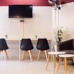 The selection of colors at the request of the clients, were attached to their corporate design. The use of toasted vermilion as the star of the ceiling and at the same time that it lowers 90 cm towards the wall, makes the space emphasize its perspective even more.