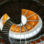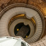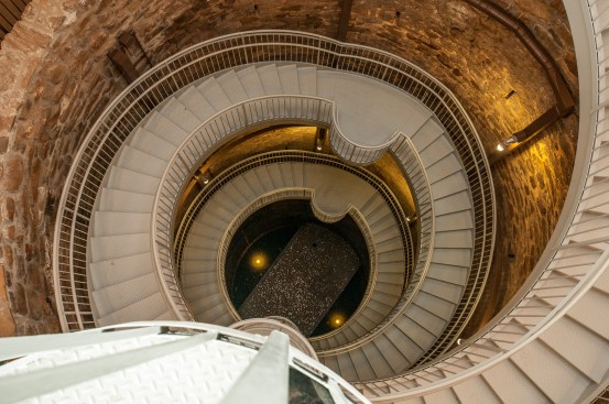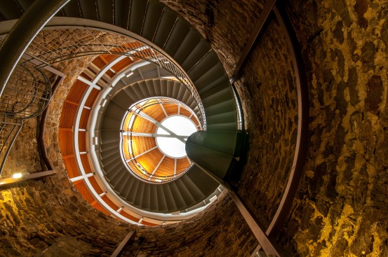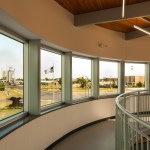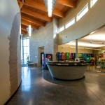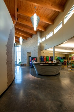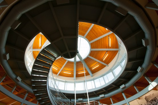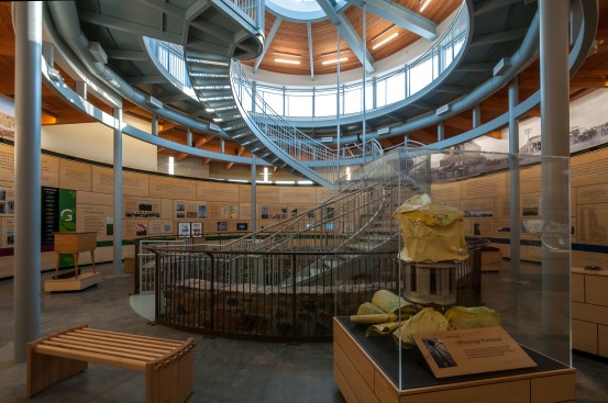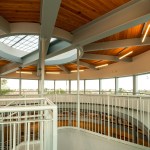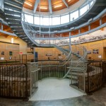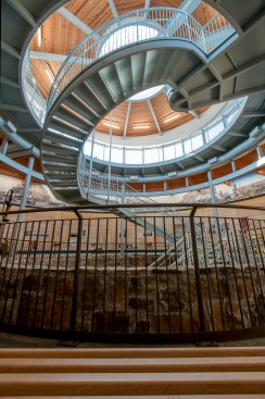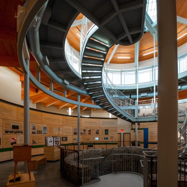 Visitors coming into the building are drawn into this spiral form which opens up into a continuous curving space with rotating wood beams spiraling overhead. The historic well is located at the center point of the spiral. Visitors can climb the spiral stairway to the crow’s nest above the well for a bird’s eye view of the towns rebuilding efforts or descend into the well via a new steel spiral stairway built adjacent to the well’s original stone wall.