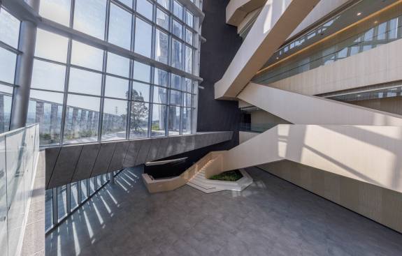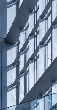 The concentration of the building volumes allows for maximum open space and facilitates connection with the central green belt. The exterior design of the building considers the environmental factors to stagger the volumes, and through parametric analysis, translates the response into a rhythmic fenestration pattern. The modular curtain wall units feature recessed glazing that provides shading when necessary while being angled towards the path of the sun, achieving an effect similar to phototropism.