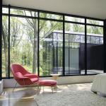 The existing slab-on-grade post-war rambler had seen many additions over the years and was, in Jameson’s estimation, a chaotic mess. So he razed most of the structure—retaining just enough to keep the budget in check—and added a second level. “The intent was to visually create this plinth from which glass volumes would emerge,” he explains. Each of the four boxes contains separate functions: a double-height living room, a double-height dining room, a master suite, and the children’s bedrooms, respectively.