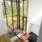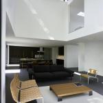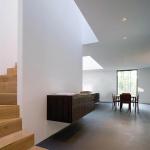 Inside, the finishes are as restrained as the house itself: white walls, black storefront framing, wood casework, dark cementitious floors on the first level, and wood flooring on the second level. “The house is conceptually simple—black played against white, positive played against negative,” Jameson says.