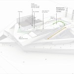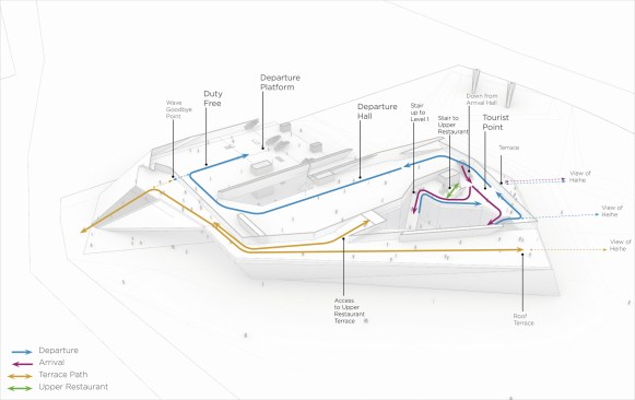 The shape of the building also enables the raising of the park towards the roof of the terminal. Beyond creating a space to greet arriving passengers, or to wave goodbye to those leaving, the terraces and green plateaus act as an elevated urban park, creating a green space for urban arts and sculptures, and viewing points over the whole Golden Mile river-scape.