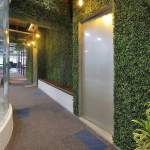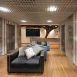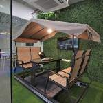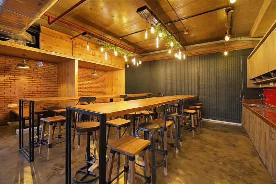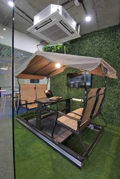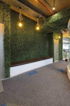 Empty, boring walls feel flat and uninspiring. Adding a green wall has completely transformed the space by making it feel fresh and inviting, and it also helps with productivity at the office. While the exposed ceiling and services harmonize with the rest of the room, the open cell ceiling gives the lounge a visually appealing cover. The cafe and green wall passage are accentuated by industrial hanging rope lights, whereas the workspace is illuminated by linear lighting. The cafeteria in the back has large high tables, while the pod seating with benches allows casual interaction. An amphitheatre corner is designed beautifully for engaging people to gather around and have fun.