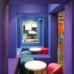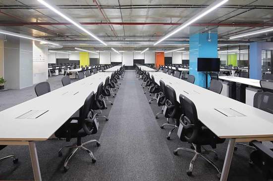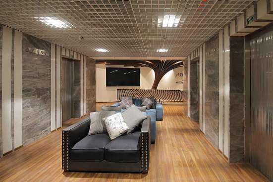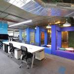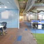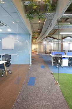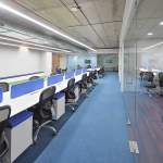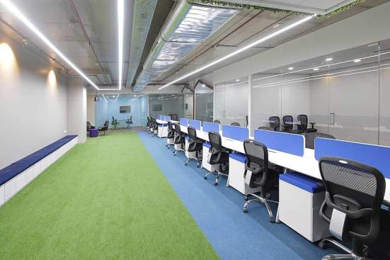 Working alone or as part of a group, this space caters for everything. It wasn’t about fitting in desks for everyone, it was about creating a studio culture, pin-up areas, places for informal meetings, and places where one could take their laptop and work in peace. Five different businesses, including the IPL cricket franchise Rajasthan Royals, collaborate in this coworking space. The workspace features 216 desks, nine meeting rooms, one huge conference room, three cabins, a cubicle, a large cafeteria, numerous breakout zones, and a cricket pitch in addition. Modular furniture in vibrant colors contrasts beautifully with carpet and wood flooring as well as glass and metal dividers within the space. Green space surrounds the building and connects co-workers to the outdoors through floor-to-ceiling glazed exterior walls.