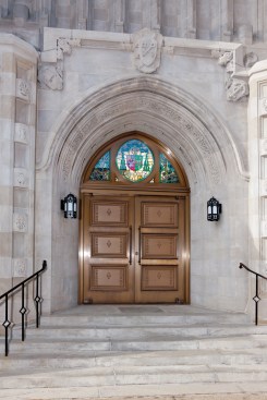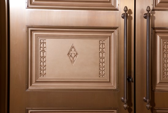 The inspiration for bronze came from the original communion rail screens around the chancel of the church. In the 1950s, the screens were removed as part of a renovation, and incorporated into a new exterior sign for the church. The design team called for custom doors that mirrored the look of the sign, creating cast bronze panels that would represent the original design and fit with the Romanesque and Early Gothic look.