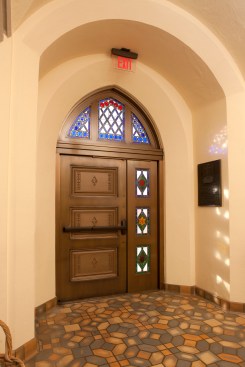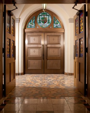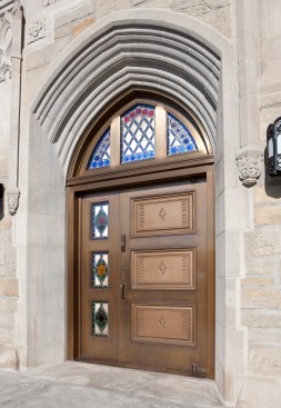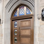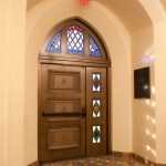 One of the changes made in the 1960s was the replacement of the original, austere looking, dark planked tongue-and-groove wooden doors with non-traditional glass doors. The glass doors did not provide a pleasing aesthetic in combination with the Romanesque and Early Gothic style of the church, prompting the most recent project team to turn to Ellison Bronze for four of their custom bronze balanced doors – a pair at the church’s main entrance, and a single door on each side of the building integrated with a panel of stained glass windows.
