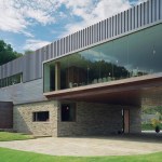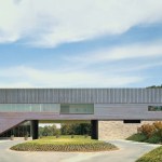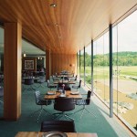 Most visitors enter the building via the stone-paved portal, stepping into the lobby—a quiet, luminous space, with Pennsylvania bluestone floors and warm cherry-paneled walls—through a pair of towering doors. From there, the entry sequence slowly reveals controlled views of the landscape, the golf course, and a Zen garden outside the expansive dining room windows.