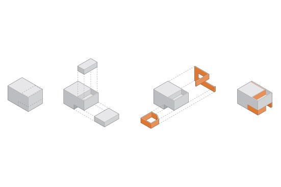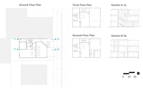 Clad in a simple palette of cedar and cementitious stucco, the building’s façade grows increasingly transparent as it rises from a monolithic wooden base to a framed, open-air terrace on the third floor. “We carved out that third floor so the façade dematerializes and you see the sky through those openings instead of an enclosed volume,” Schmaling says. “The intent here was to erode the volume as it rises up to the top, and reduce the visual weight that it has on the street.”