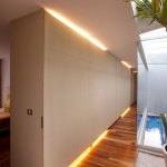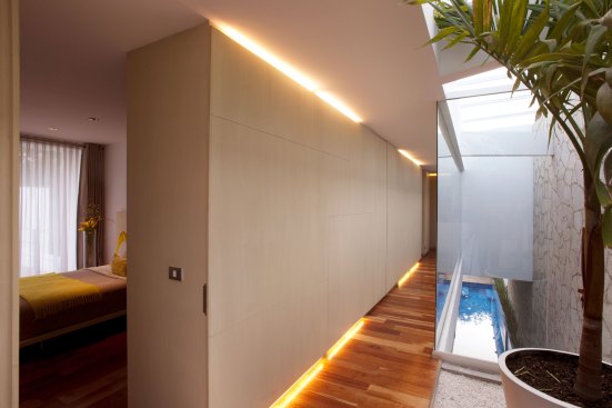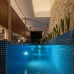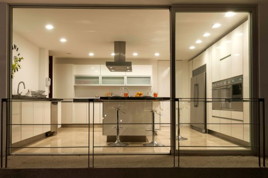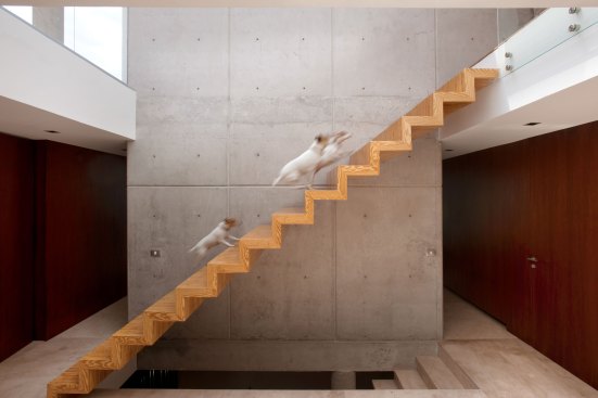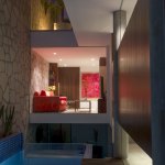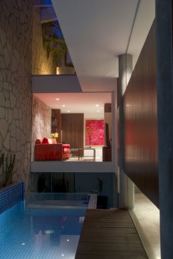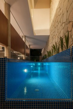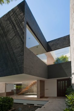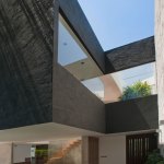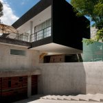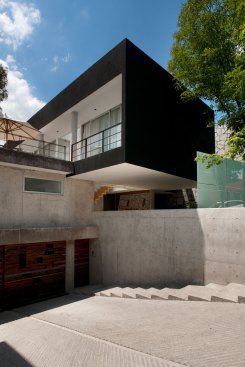 Block House is originated from the transverse overlap of two volumes, creating a set of contrasts between solids and voids. A longitudinal black concrete prism becomes the main piece as it rises from the ground and perches on top of a gray concrete prism, in a non-geometric balance. The swimming lane is a fundamental element; located on the left side of the house next to the party wall, it displaces the volume and generates a light opening, which gently bathes in light the ground floor. The common areas are located on ground level, in direct relation with the exteriors; while the private areas are located inside of the suspended volume, in a condition of greater privacy. The rooftop of the transverse volume is taken advantage of with a terrace that serves the entire upper floor. The structural design was dictated by the intention of giving lightness and volatility to both prisms. Slender columns support the black prism and free the space beneath it. Materiality emphasizes the contrast between solid and light. Wood and marble stones used on interiors complement the aesthetics of the house. Block House proposes a form that invites to inhabit inside and outside.