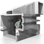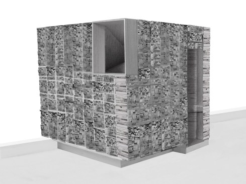 Bloodline: Self-Consuming Barbecue Pavilion is a grill pavilion in the forest outside Stuttgart, Germany, in the grounds of the eighteenth century castle ‘Solitude’. Bloodline begins as a cube, clad with grillholz (local barbecue wood), which conceals a grilling and preparation space, enclosed in a more complex interior lining.The exterior grillholz cube is consumed as the grill is used, gradually revealing the asymmetric fire-space inside.