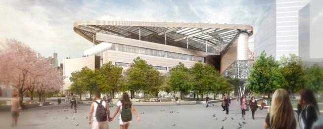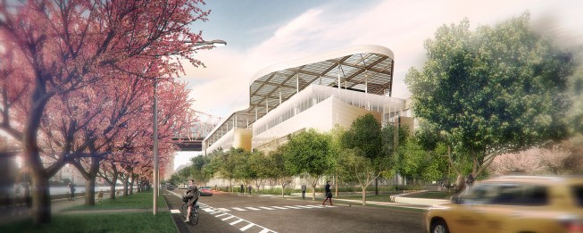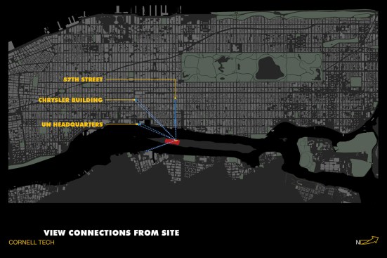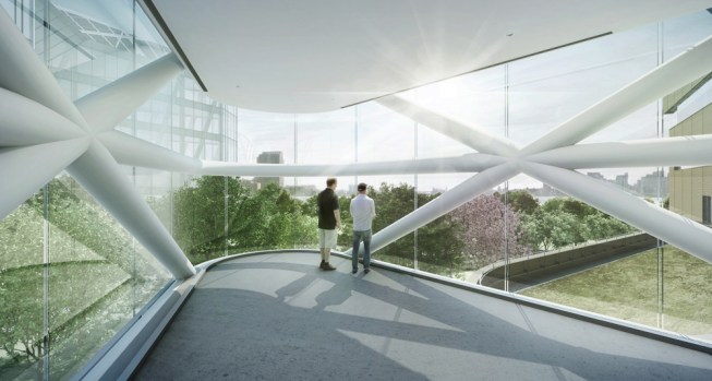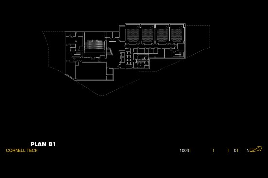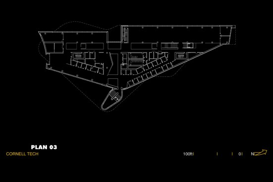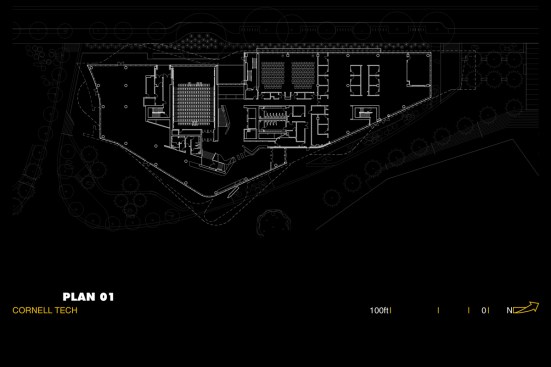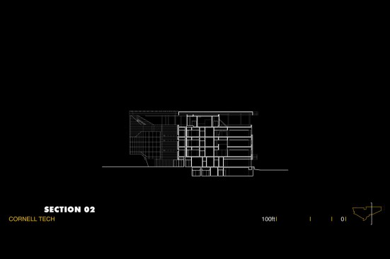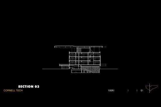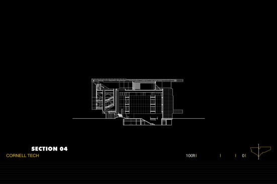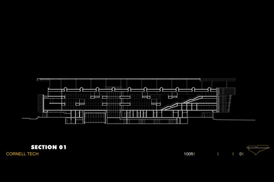 Slated to open later this year, the Bloomberg Center is the first of three main buildings in the $2 billion Cornell Tech campus on New York’s Roosevelt Island. Part of former New York Mayor Michael Bloomberg’s 2011 initiative to make the city a global hub for technology development, the campus is a joint venture between Cornell University in Ithaca, N.Y., and Israel’s Technion University. The Bloomberg Center proper will house research, teaching, and meeting space for graduate-level STEM students and faculty; the other two buildings will, respectively, offer university housing and offices for companies working with Cornell’s various science departments. Designed by Culver City, Calif.– and New York–based Morphosis Architects, the 150,000-square-foot Bloomberg Center sits along a north-south axis on a narrow plot at the western side of the 12-acre campus, and is organized around an entry lobby that aligns with 57th Street in Manhattan, visually tying the campus back to the city. A monumental staircase oriented toward Queens, to the east, rises from the first floor—which features an auditorium and two large lecture halls—up through the center’s four additional levels, which are populated by open-plan classrooms along the building’s western edge and smaller private meeting rooms and faculty offices to the east. As part of the campus’ overall sustainability mandate, the Bloomberg Center aims to be a net-zero energy consumer: Its roof features an overhanging “energy canopy” with a solar array that also shades a roof terrace; the building also sports a geothermal well system and a rainwater collection tank.