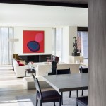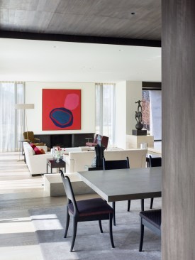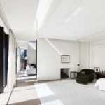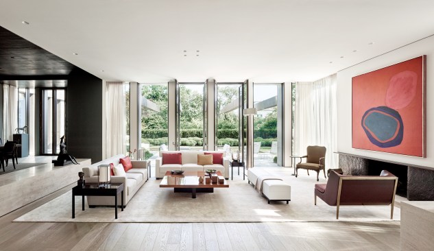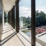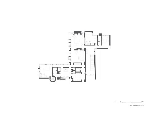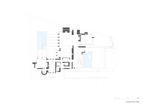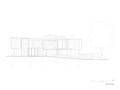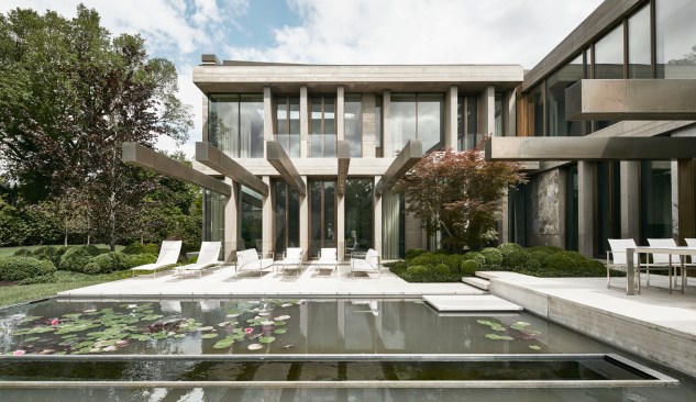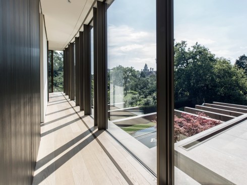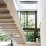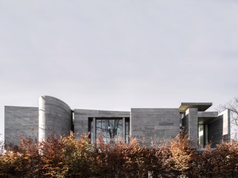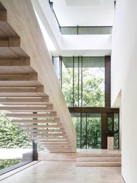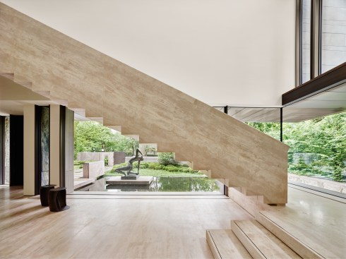 The two storey home is organized and conceptualized as two intersecting L-shaped volumes, creating an entry forecourt and a larger rear court. This approach maximizes light and enables a continuous connection between interior and exterior spaces as you move through the house. Though it is a large home—built to the edges of the lot lines— the open space created by the front courtyard pushes the façade back, thereby diminishing its visual presence on the street. Vertical fins of Algonquin, crust-faced limestone ground the heavy massing of the second floor, thus emphasizing the intrinsic quality of the stone and reinforcing the raw, sculptural quality of the front façade. Conversely, the back façade of the house is defined by large expanses of glass, expressing the rear courtyard and gardens as an extension of the home. This space within a space is defined by horizontal brass beams and fitted with lights. Each court includes a reflecting pond to further define the spaces and soften the stone and metal elements. Internally, a feature stair of honed beauval limestone, together with a grand living room area that opens directly to the rear courtyard is the active, public centre of the house. The extremities of the L-shaped configuration become the private realm for the occupants: the front of the house contains the owner’s office on the ground floor and guest bedrooms above, while the back of the house contains a private master suite. The interior architecture is a continuation of the exterior language of the home. Beauval limestone, complementing the honed limestone façade, is used on the floors along with smoked and brushed European oak. Calacatta marble in the master suite bathroom adds to the sculpted look, while ebony and bronze accents add to its earthiness. Horizontal reveals along the length of the walls above the floor; vertical lines that flow to horizontal lines from floor, to stairs, to wall; the solid stone sculpted handrail of the feature stair; the full-height, smoked oak doors; are all created to have a seamless appearance within the interior that wraps and extents to the façade. Sustainability is integrated into the design of the house. Orientation, massing, and glazing are carefully considered to maximize direct and indirect daylight. High performance glass throughout allows the large open spaces of the home to be comfortable year-round. Beneath the home, twenty one geothermal pipes provide ground source heating and cooling for the home. Craftsmanship and attention to detail give the home a quiet elegance and continues the carved expression of the home.