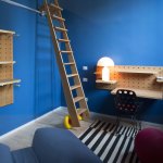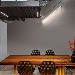 The project organizes the space by volumes rather than in plan. This approach will soon discover a need for a mezzanine and leads to a design of an iron footbridge. Together with the staircase it will become the axis of symmetry, rotation and sliding of the whole apartment. As a result, the plan and the section seem to be squeezed in the middle like a butterfly shaped pasta.