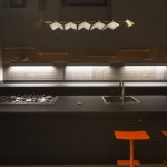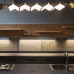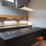 Almost all pieces of furniture have been custom designed: “POI” is a modular system of drilled panels and shelves; “BAU” is a dining table made of a black walnut top held by four brass feet with different folded shapes that enter and cut the wooden top; “ZAG” is a suspension kitchen lamp made of a bended brass sheet and luminous panels. On the ground floor, there is a big kitchen with doors made of corrugated aluminum sheets. It has been designed by Vico Magistretti, as well as the lamps Fresnel and Atollo.