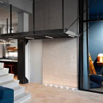 The spaces, volumes and functions are gently intertwined to enable the flow of light, air and sight. Most of the vertical partitions are glazed and softly obscured by draperies to protect the privacy at night.