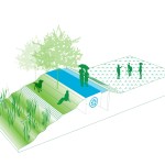 “Too often designing for resiliency occurs as a reaction to a singular disaster, Katrina for New Orleans or Sandy for New York City,” said Laura Cohen, one of the Blue Current DC team members. “Rather than waiting and reacting to an event, we wanted to create a proactive intervention that would become a permanent, visible part of the landscape and the city and an active amenity for the community during both wet and dry conditions.”