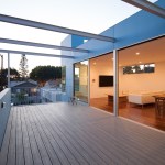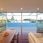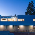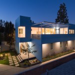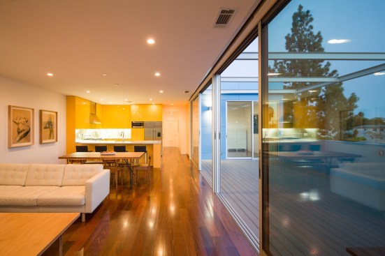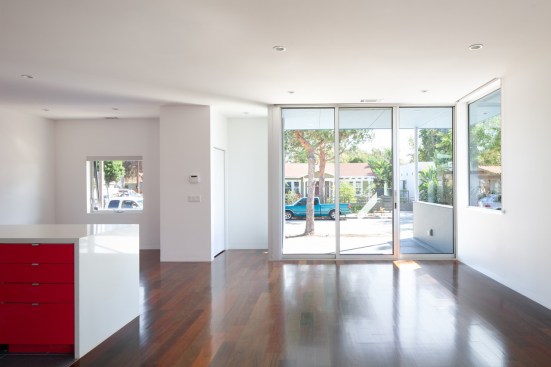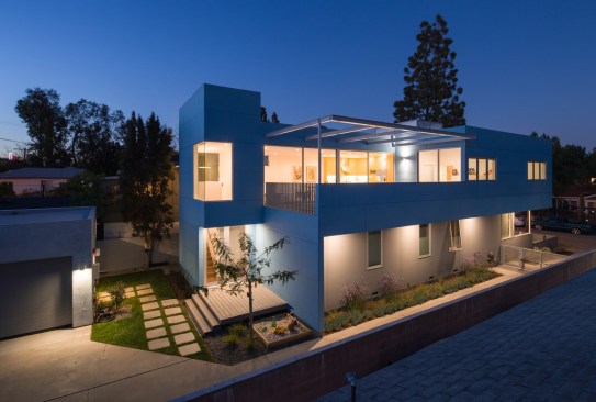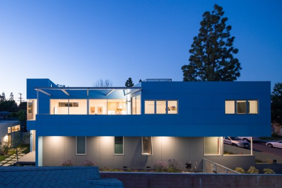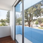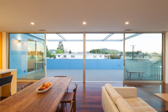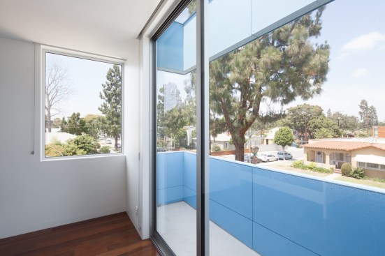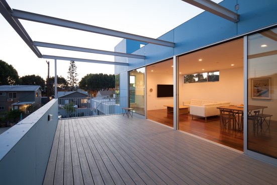 Our project embraces low-rise duplexes and courtyard apartments as the future of increasing the housing supply in Los Angeles. This housing type can provide more diverse occupancies while maintaining the scale and character of its typical suburban context. By intensifying the utility and flexibility, we enabled both environmental and financial sustainability, which subsequently translated into opportunity for architecture. Large openings and glass are coveted for natural light, indoor-outdoor living, cross ventilation, etc., but they are expensive and typically out of reach on modest scale projects with limited resources. Strategically, we took what could have been a medium sized single-family dwelling and split it into two units. As such, the building and design would be supported by the income of two households, which then tenably allows for a larger array of architectural features. These features are then organized and distributed equitably across the site and between the units to create private entries from large outdoor spaces and yards connected by the aforementioned generous glazed openings. Our duplex is a stack with primary entries located at the front and back of the building. The lower unit maintains the existing streetscape engagement with a fenced-in front yard, a covered porch and landscaping. The upper unit is organized around a large deck covered by a stretch fabric awning across a steel trellis providing shade that cools a large portion of the building. Finishes were chosen for their off-the-shelf cost effectiveness and resiliency to minimize future maintenance costs. The largest available panel of fiber cement boards are laid over a rain screen and oriented (horizontal above and vertical below) and painted to maintain separate identity of the two units. The decking is a wood composite and the metal railings, screens and steel trellis members are hot-dipped galvanized. All interior surfaces are smooth and easily wipeable and cleanable. The blue is a tongue-in-cheek tactic to blend the upper floor into the sky and a cheerful addition to contrast from the typical drab suburban palette.