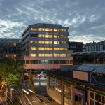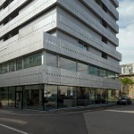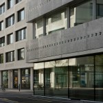 A mixed-use program of office and retail, with private residences above, define the Blumenhaus. The building is an integral component of a larger effort by the city of Zürich to rebrand its Escher-Wyss district through a metamorphosis of new development, including green spaces, bikes lanes, and a plethora of new housing. The district is characterized by its industrial heritage, and palette of raw concrete, burgundy brick, and rusted steel; it is bounded to its north by the Limmat River, and to its south by the entanglement of railway tracks that lead to the city’s main train station. Blumenhaus is adjacent to a former ship-building hall–or Schiffbau, in German–of Escher Wyss & Cie., an industrial company that was absorbed by another in the twentieth century; its expertise was turbines and electrical engineering. When the company left this location, the area began to decline in its industrial prominence, opening a path toward its redevelopment. Yet, some industry continues to inhabit the district, enabling a confluence of gastronomic, commercial, service, and other residential-supporting businesses to further define this once neglected area, just north of Zürich’s old city center.