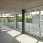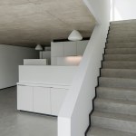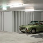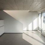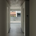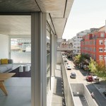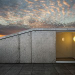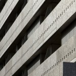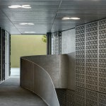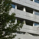 Blumenhaus’ ground floor façade is free on three sides, which maximizes street-facing frontage, and ensures the ground and first floors remain flexible. The west façade abuts an adjacent housing building, at an acute angle, which enabled the creation of the parking garage entry along the northern façade; it slightly curves as it descends, allowing the inversely curved space at ground floor, to function as the residents’ entry point. Accordioned matte-aluminum panels, ‘punched’ with the same hibiscus flower silhouette at high density, enable physical security for the building’s inhabitants, by acting as a gate, while allowing visual permeability. Numerous cloverleaf columns are to be found throughout the interior, echoing exterior ornament; a spiraling concrete staircase swirls from the parking garage to the first floor. The top five floors contain 23 units, all rental apartments oriented in at least two directions–each with a north-south orientation, or an exposed corner–with most having access to natural light along the southern façade. Loggias wrap the Blumenhaus’ three free façades, which function as balconies. Four units of the top floor have staircases that lead to individual, generously sized private roof terraces; floor to ceiling glazing and oversized opening elements prelude exterior spaces, thus enabling ‘loggia living’.