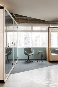 In addition to hybrid spaces, which can be transformed as needed, the reinterpretation of the office also appears in flexible furniture. Another important feature of the project, which reinforces the bank’s concern with inclusion and diversity, was the creation of gender-free bathrooms. “They insisted on the gender-free toilet. The bank is very concerned about diversity and representativeness”, emphasizes Vidal.