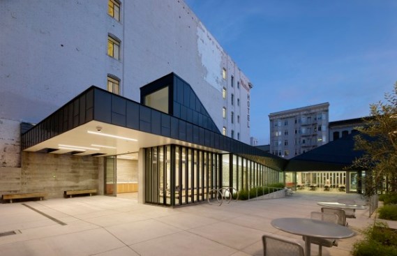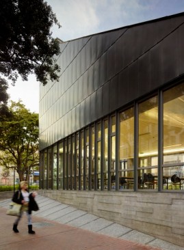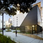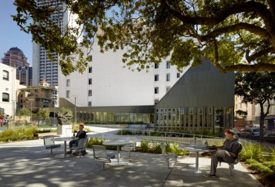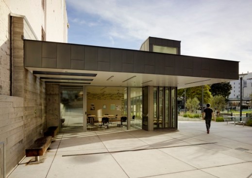 San Francisco’s Tenderloin is the City’s densest neighborhood, and most of its residents live below the poverty line in small apartments without access to back yards or green space. Re-built in 1985, Boeddeker Park never lived up to its potential as the neighborhood’s largest public park. Early attempts to address safety concerns resulted in a maze of fences and visibility across the space was poor. Neighbors called it “Prison Park.” In response, The Trust for Public Land, in partnership with the City of San Francisco, teamed with WRNS Studio to redesign and completely rebuild the one-acre park and clubhouse to meet the needs of the community. Together, The Trust for Public Land and WRNS conducted extensive community outreach, holding public meetings and forums at the site as well as at nearby youth centers, senior centers and churches — wherever local people were likely to come. Key decisions were made at these forums. The result is a new landmark park and clubhouse that serves as a model of civic engagement, inspiration, resource conservation, and adaptability. The clubhouse was conceived as an inviting living room for the neighborhood. Its geometries and language are derived from integration with the park and a respectful contrast to the surrounding neighborhood fabric. This building extends both the tradition of San Francisco clubhouse design and the history of delightful contrast found in Tenderloin architecture. Organized around two flexible gathering spaces, the clubhouse’s main recreation room fronts Eddy Street and frames the main park entry on the street. The form of the room reaches to the sky for light and volume and bends into the park to strengthen the feeling of “park pavilion.” This room opens to the main entry plaza. The recreation room is transparent, making interior activities evident to both the neighborhood and park. Addressing the community’s need for open space that supports a wide age-range of patrons, park amenities include different areas supporting adult exercise, basketball, youth play structures, and socializing and gathering. Boeddeker Park is one of the first participants in the Sustainable Sites Initiative, an interdisciplinary effort led by the American Society of Landscape Architects, the Lady Bird Johnson Wildflower Center and the United States Botanic Garden to create voluntary national guidelines and performance benchmarks for sustainable land design, construction, and maintenance practices.