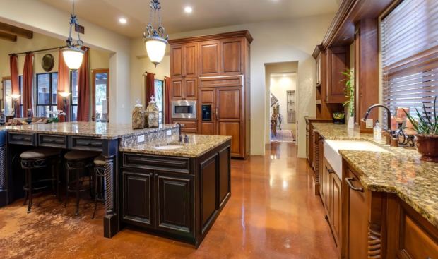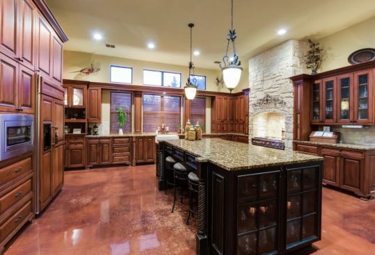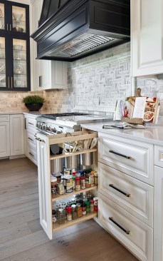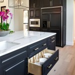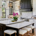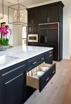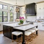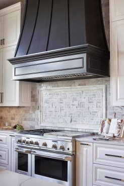 Our clients purchased an existing home when they relocated to the area because it was situated on a desirable lot. Unfortunately, the interior of the home was not their personal taste. It was rustic style with stained concrete floors, wheat colored walls, a heavy stacked stone range hearth and dark knotty alder cabinetry. The homeowners envisioned a light and airy space with white walls, sleek finishes and a transitional to modern style. They described their style as "crisp and clean" with modern touches. We felt that the best way to achieve this look was to bathe the kitchen in white (white walls, countertops and cabinets), but to add depth to the space with the accents of black cabinetry and to add warmth with gray European oak flooring. The existing cabinets were actually good quality and the appliances were also only a few years old. So, to save money, we filled in the knots on the base cabinets and the tall refrigerator cabinet and painted them to make them look new. We remade all new upper cabinets, a new range hood, and a new kitchen island to match the existing doorstyle of the original cabinets and painted them the same colors. This was a huge cost savings without sacrificing the design aesthetic at all. A touch of sophistication and subtle pattern was added in the marble backsplash and modern elements finished off the room, including the champagne gold lighting and plumbing fixtures, sleek cabinetry hardware and modern barstools. Challenge #1: The massive stone range hearth weighed approximately 2,000 lbs and was the focal point of the existing kitchen. However, it certainly did not fit into our transitional, crisp and clean, design concept, but it would not be easy to remove. Solution #1: The demo team, donning their protective hard hats and glasses, took out the stone kitchen hearth one rock at a time, carefully handing them down from the tall ladder to someone waiting below. It took two days just to demo the range hearth. The homeowners agreed to keep the rocks as landscaping around their pool, so fortunately, we did not have to haul them away. It was a win-win! The rustic stone range hearth was replaced with a sleek new custom wood hood, which was much more in keeping with our design concept. Challenge #2: Once the range hearth was demoed, we realized the existing base cabinets that we were going to re-use were 39" tall. The standard height for base cabinets and appliances, is only 36" tall. Our 36" tall range suddenly looked dwarfed by the tall base cabinets on either side of it. Solution #2: We put our heads together with our talented cabinet maker and decided to build a 3" tall platform for the range to sit on to raise it to the same 39" height of the base cabinets. We built a sturdy platform from wood and wrapped it in stainless steel. No one has ever noticed it, unless we point it out! Challenge #3: The new custom range hood measured approximately 60” tall x 64” wide. It was the largest hood our cabinet maker had ever constructed and we were not quite sure how we would lift it twelve feet into the air to install against the ceiling. It was both heavy and cumbersome. Solution #3: Once again, our cabinet maker saved the day and rigged a custom cart with wheels to roll the hood into place and then he devised a hand crank to crank it up into the air. It took several guys to hold it in place while they bolted it to the studs in the wall. I think we all held our breaths the entire time, but the end result was definitely worth it! Challenge #4: Our large kitchen island, which is approximately 90" x 90" required two slabs of quartz for the countertop and we did not want to have a large unsightly seam. Solution #4: We designed the main part of the kitchen island to be 39" tall to match the existing perimeter base cabinet height. We then dropped the barstool seating area to 36" tall to perfectly fit a counter height barstool. Now, our two tier island is functional and beautiful without a large distracting seam.