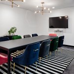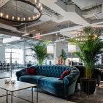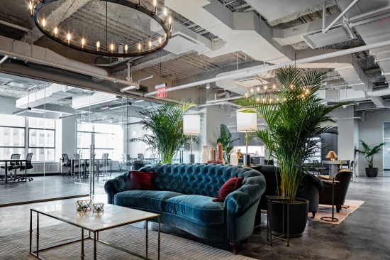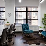 The 60 Broad Street space, among Bond Collective’s largest locations, comprises two 20,000 square-feet floors, conveniently connected with a public stairway to ensure easy access between the two. Spector Group created a comfortable, yet premium atmosphere by incorporating plush furniture and small gathering spaces outside of the offices. High-end materials, including acoustic fabrics, luxury vinyl tiles and a glass wall system, are employed throughout. The large suites range in size, with the largest accommodating 25+ people and the most premium including a personal conference room or an executive area.